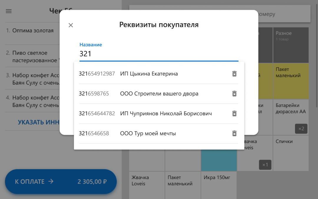 - В следующий раз касса показывает на экране эти реквизиты, как только сотрудник начинает вводить то же название или ИНН.